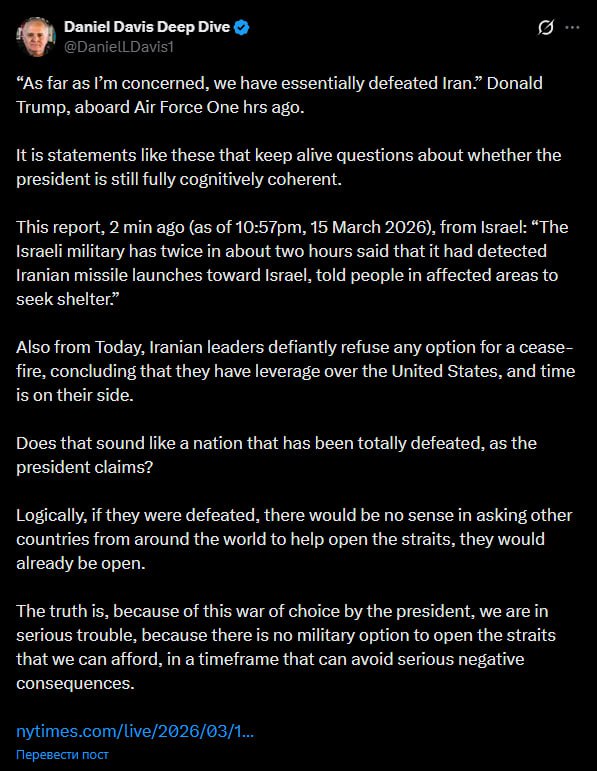 Разве это похоже на страну, которая потерпела полное поражение, как утверждает президент? Логично предположить, что если бы Иран действительно был разгромлен, не было бы необходимости просить другие страны со всего мира помочь открыть проливы — они уже были бы открыты.