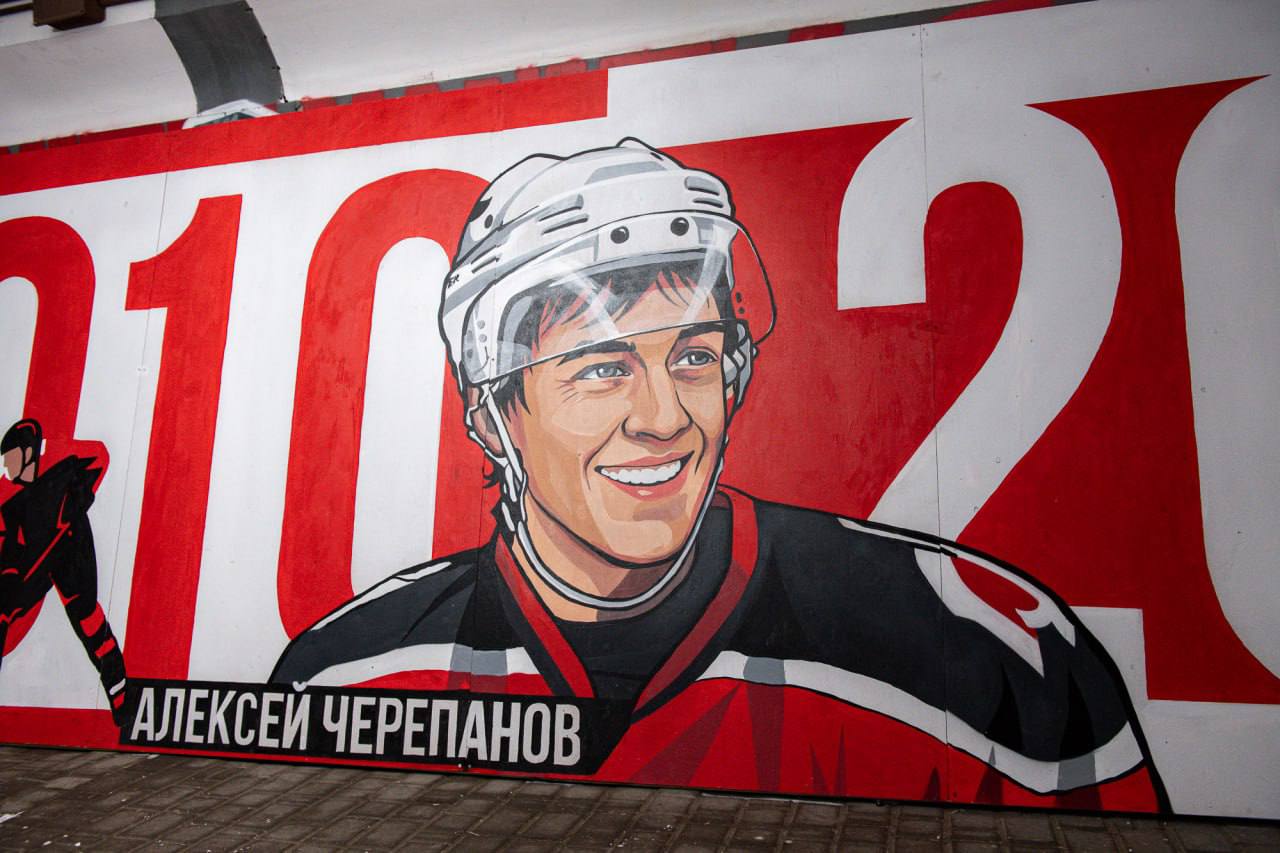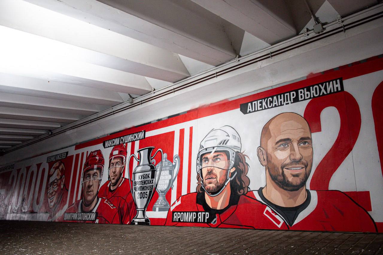 Арт на 50 метров рассказывает об эпохах развития хоккея в регионе — от главных побед, до легенд прошлого и нового поколения хоккеистов.