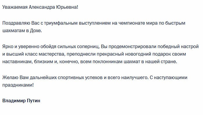 Владимир Путин поздравил шахматистку Александру Горячкину с победой на чемпионате мира по рапиду в Катаре.
