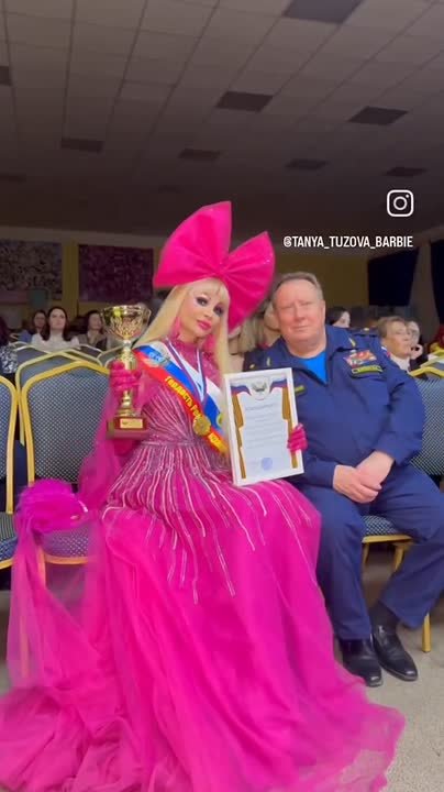 Таня Тузова, представляющая себя куклой Барби на русский лад, неделю назад получила за какие-то заслуги медаль, выпущенную к 300-летию великого Михаила Васильевича Ломоносова. Вроде бы пора остановиться. Но нет. Теперь женщина в розовом засветилась на сцене московского Дома офицеров.