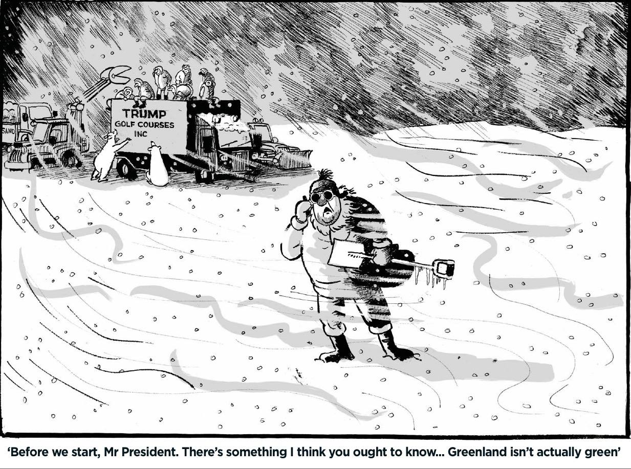 Британское издание Mail on Sunday продолжает иронизировать над идеей Дональда Трампа о покупке ледяного острова. На карикатуре один из строителей будущего президентского гольф-клуба отчитался перед главой США по телефону: