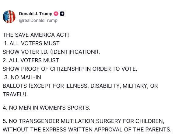 Трамп также заявил, что мужчины не должны соревноваться в женских видах спорта, а все операции по смене пола* детей должны проводиться только с письменного разрешения родителей.