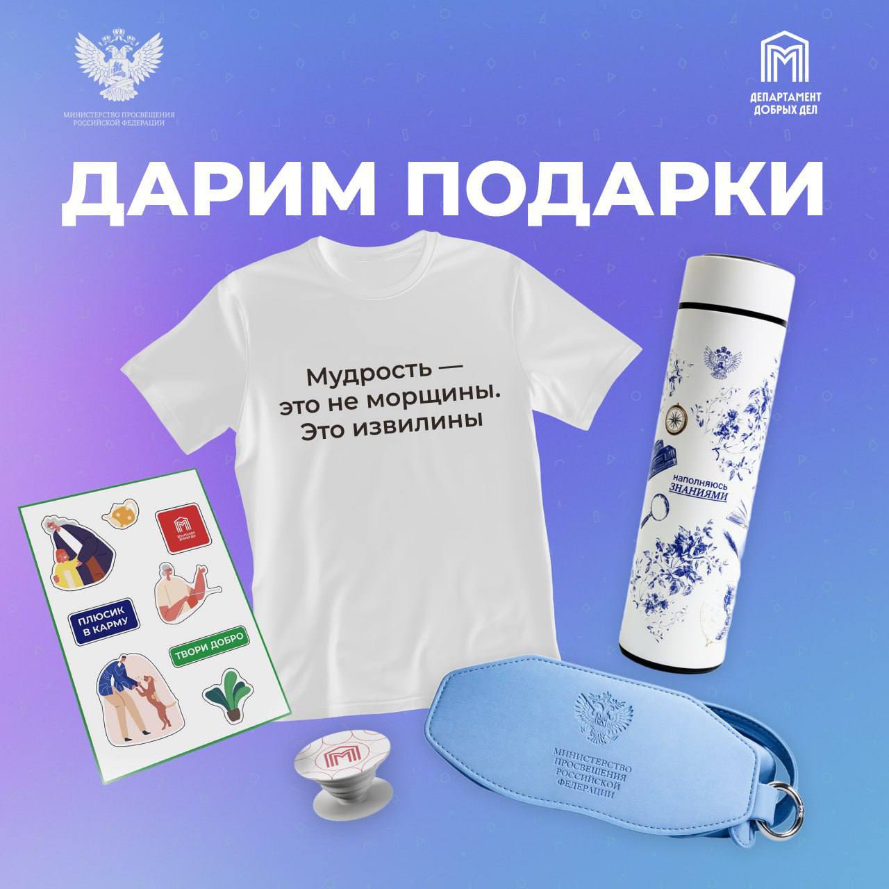 Каждый из 4 счастливчиков получит: термос, очешник, футболку с надписью, набор тематических наклеек и попсокет.