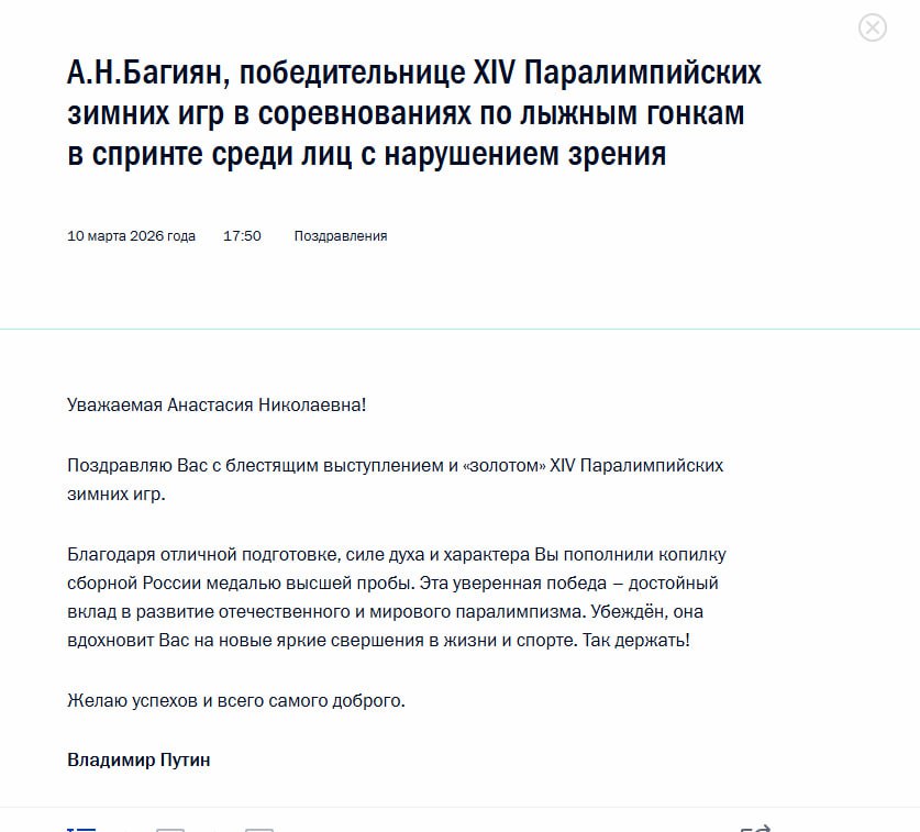 По случаю уже двух выдающихся побед президент Путин отправил поздравительные телеграммы.